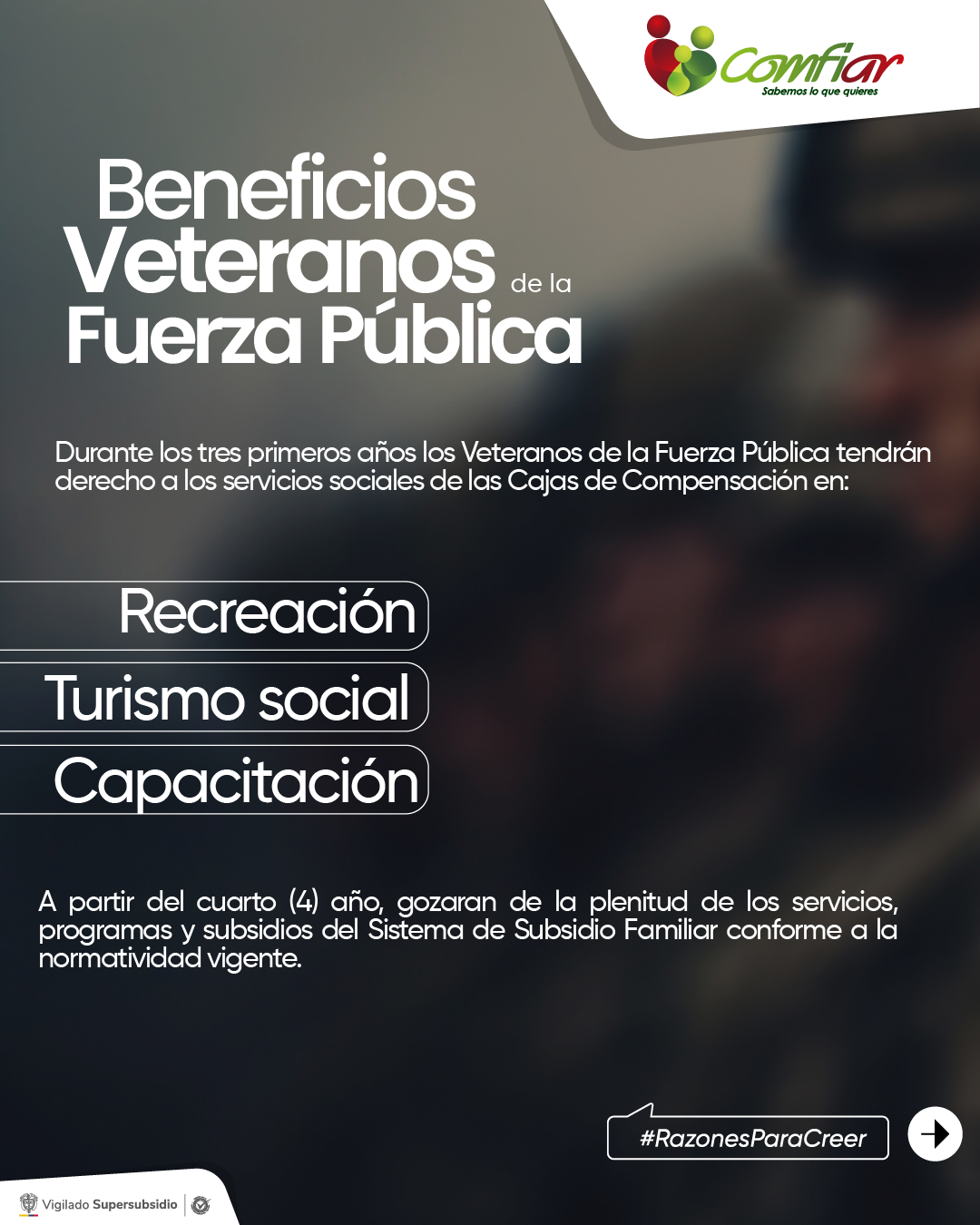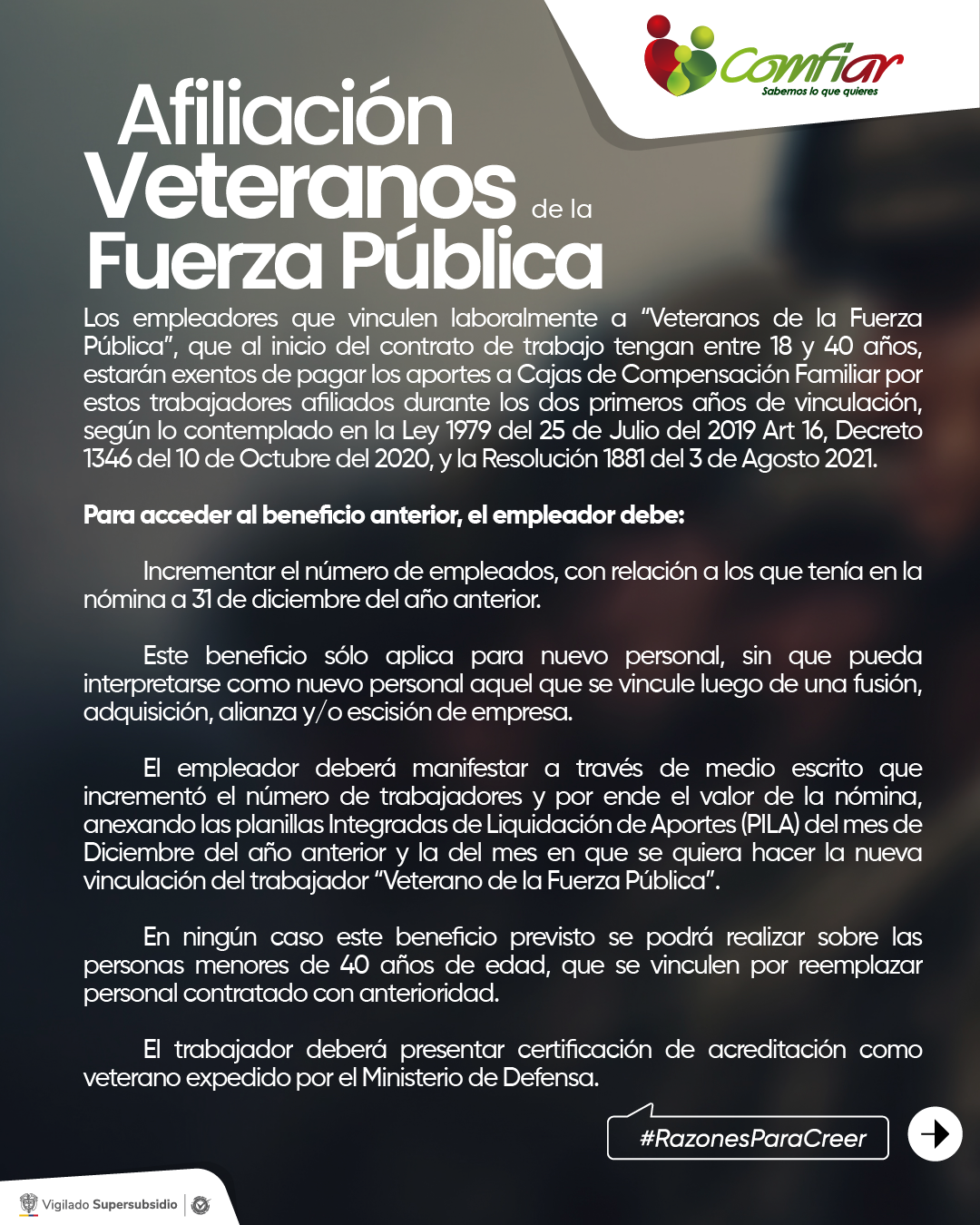 Los Empleadores que vinculen laboralmente a “Veteranos de la Fuerza Pública” que al inicio del contrato de trabajo tenga entre 18 y 40 años, estarán exentos de pagar los aportes a Cajas de Compensación Familiar por estos trabajadores afiliados durante los dos primeros años de vinculación; según lo contemplado en la Ley 1979 del 25 de julio del 2019 Art 16, Decreto 1346 del 10 de octubre del 2020, y la Resolución 1881 del 3 de agosto 2021.