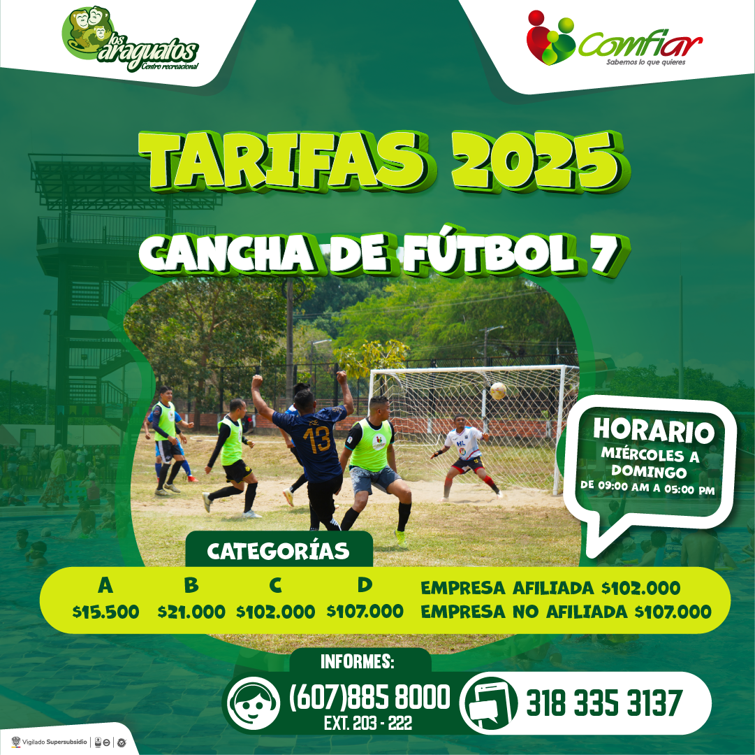 - Cancha fútbol 7: lunes a domingo de 8:00 am a 5:00 pm