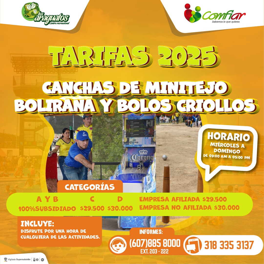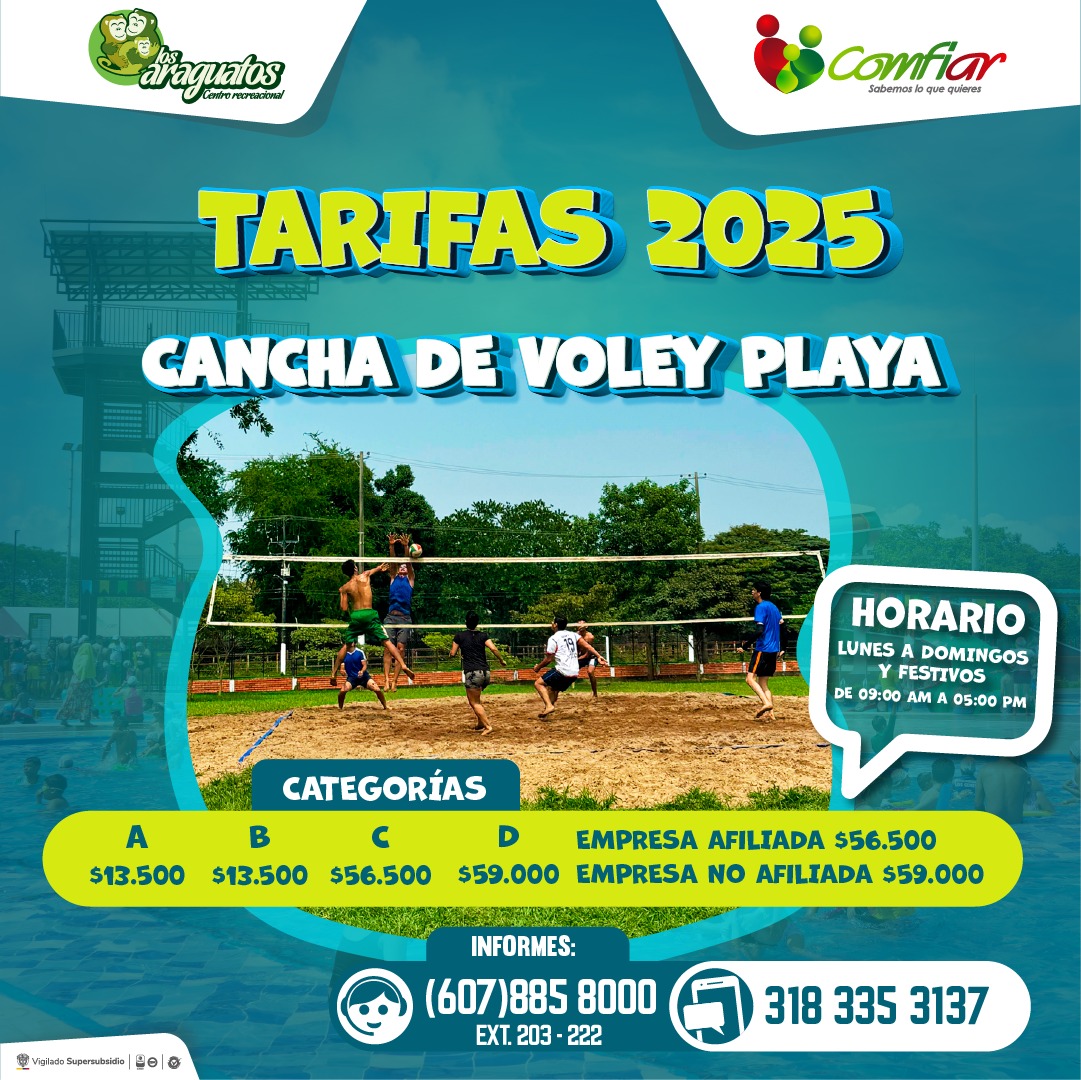 - Voleibol – Cancha sintética Fútbol 5: De lunes a domingo de 8:00 am a 05:00 pm o en caso de requerir un horario especial comunicarse el celular 3183353137.